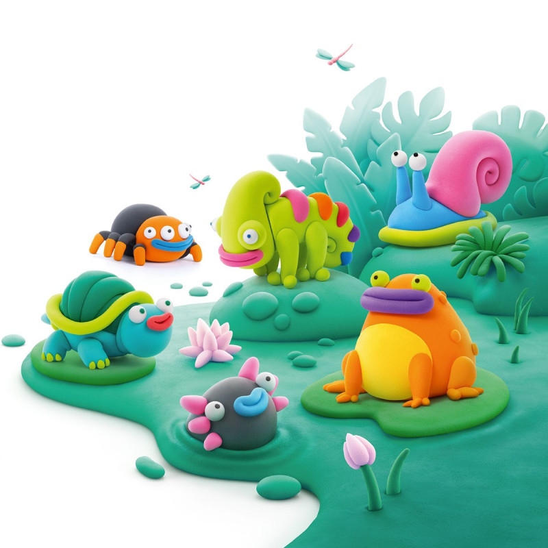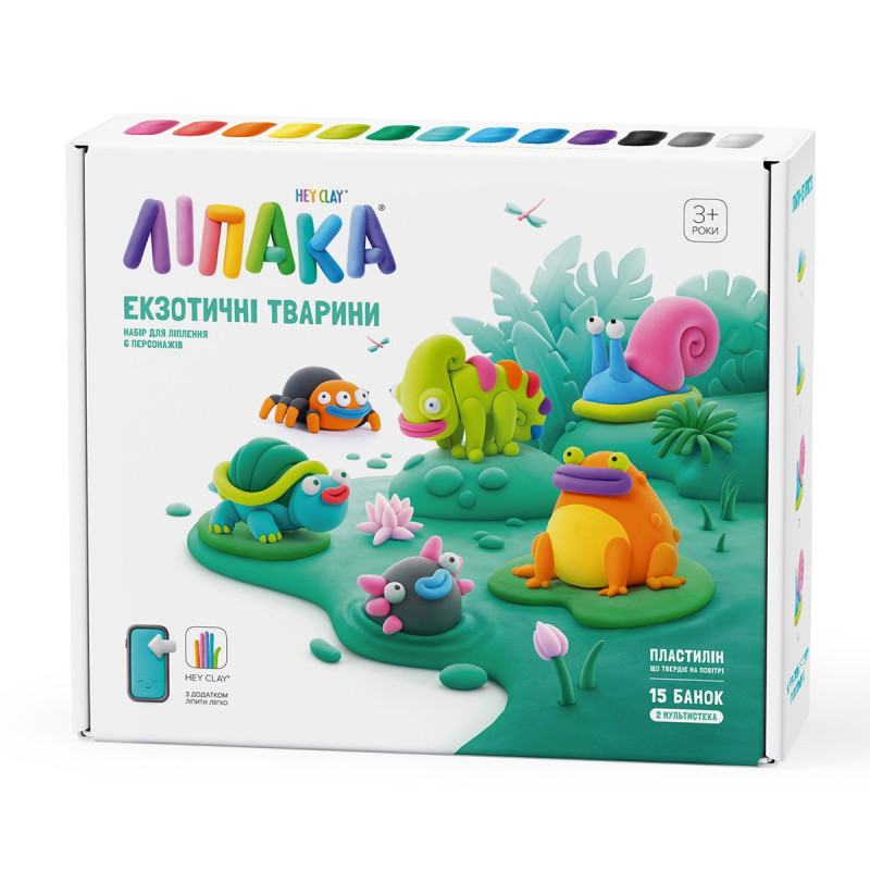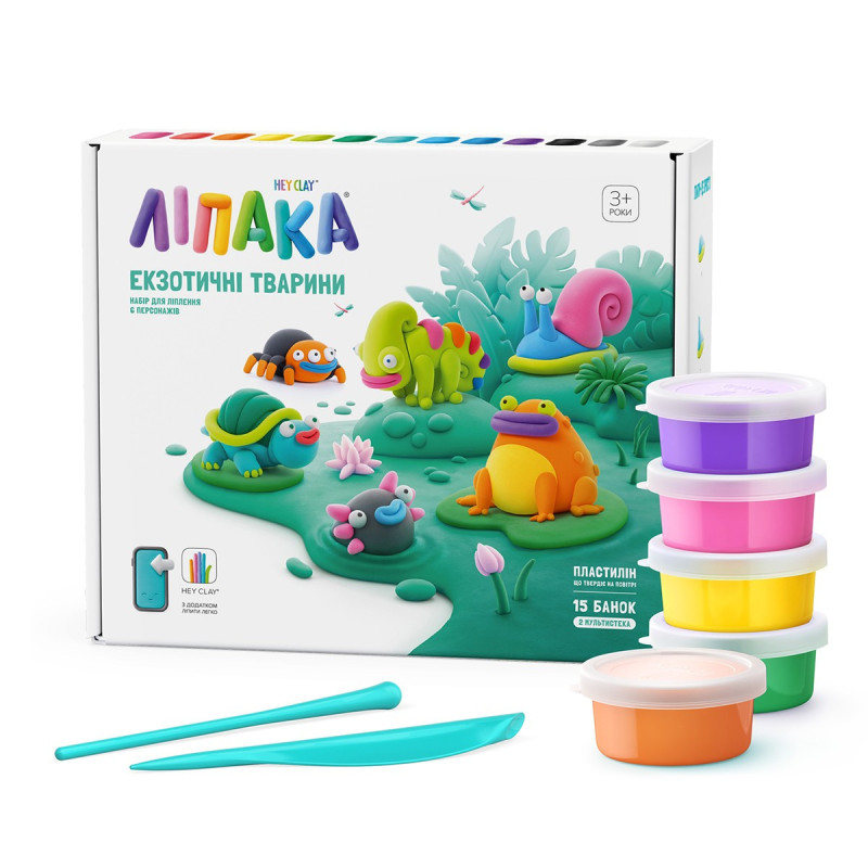 Меганабір пластиліну, що самостійно твердіє, ЛІПАКА - ЕКЗОТИЧНІ ТВАРИНИ – розважить і малюків, і дорослих. За допомогою анімаційних інструкцій в застосунку HEY CLAY, ви зможете зліпити 6 кумедних тваринок: хамелеона, тарантула, гастропода, черепаху, помаранчеву жабу й аксолотля. Пластилін твердіє на повітрі протягом 24 годин, після чого можна гратися створеними фігурками.