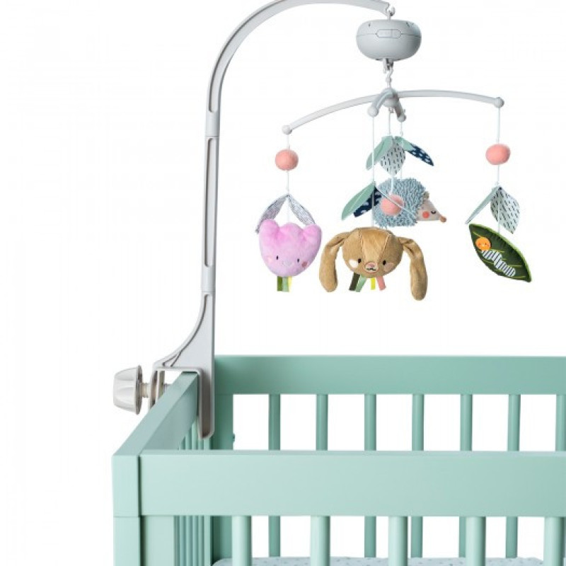 - Обов'язково приверне увагу малюка плавне обертання чотирьох м'яких різнокольорових іграшок – їжачка, кролика, тюльпанчика та листочка з гусеницею.