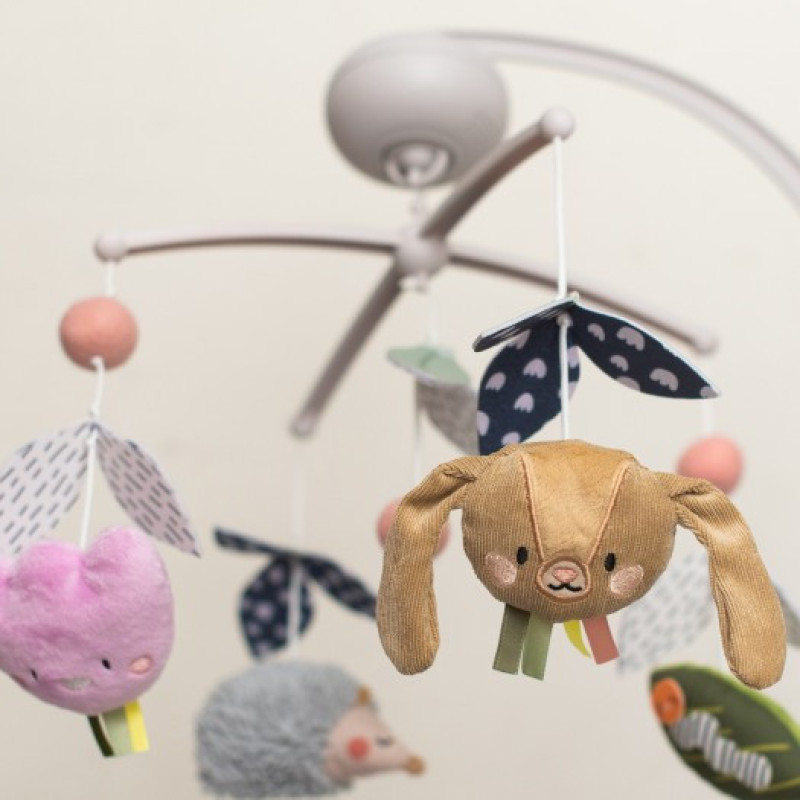 Музикальний мобіль, виконаний в спокійних природних тонах, допоможе заспокоїти малюка перед сном.