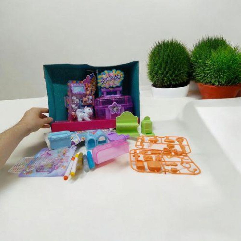 Комплектація: 6 собачок, валізка, будка, годівниця, миска, переноска, шафка з аксесуарами, брелок, 2 фломастери, 3 кольори гліттера, набір стразів, наклейки