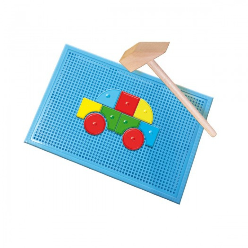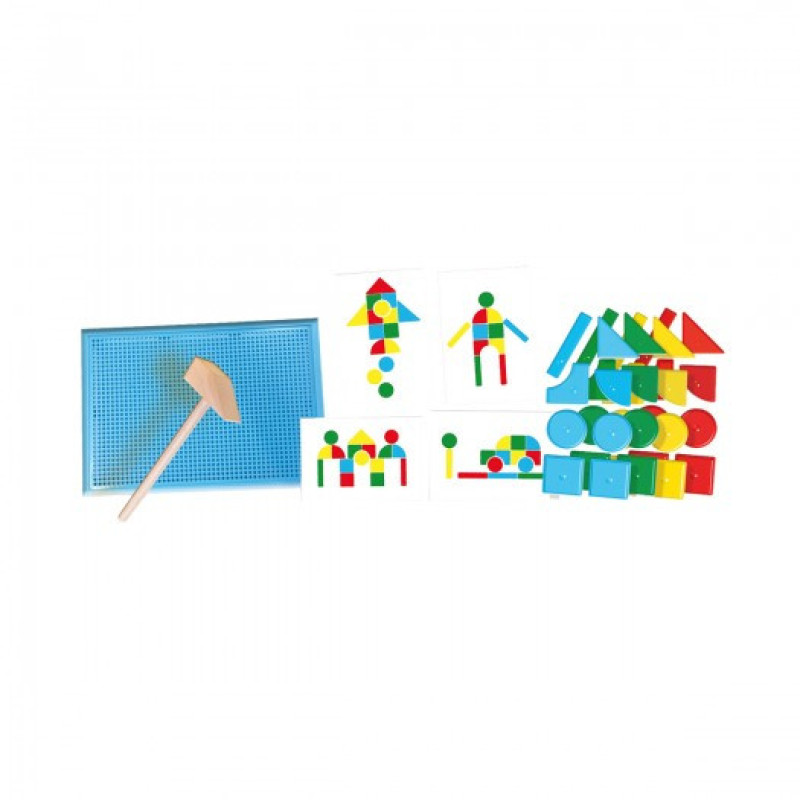 Дерев’яний молоток, пластикова дошка, 32 різнокольорові пластикові фігури, приклади малюнків