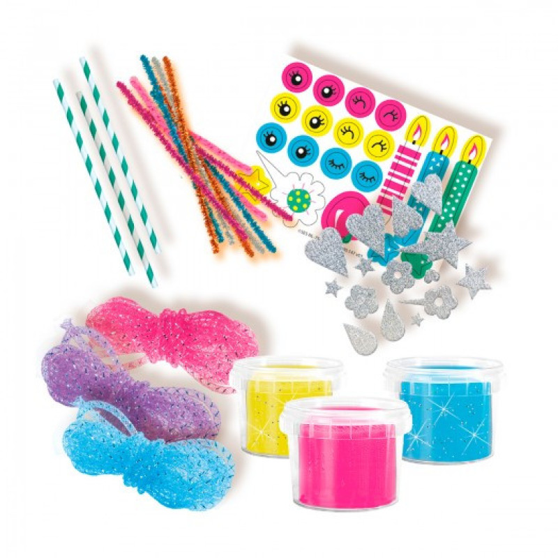 В комплект входить:3 баночки з масою для ліплення по 90 gr, 10 стиків синелі з блискітками, 3 кольори біжутерної сітки