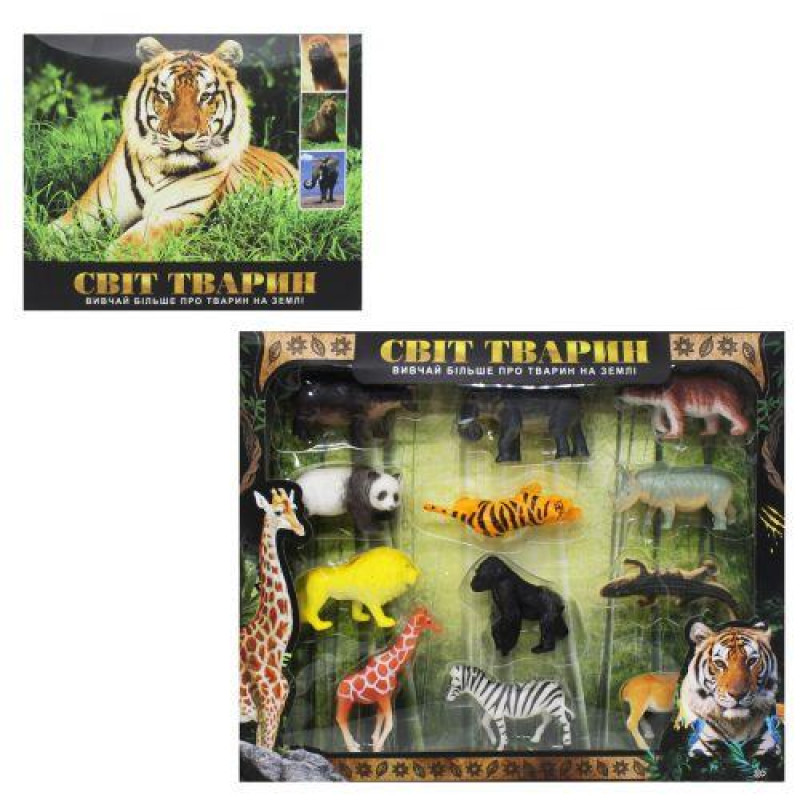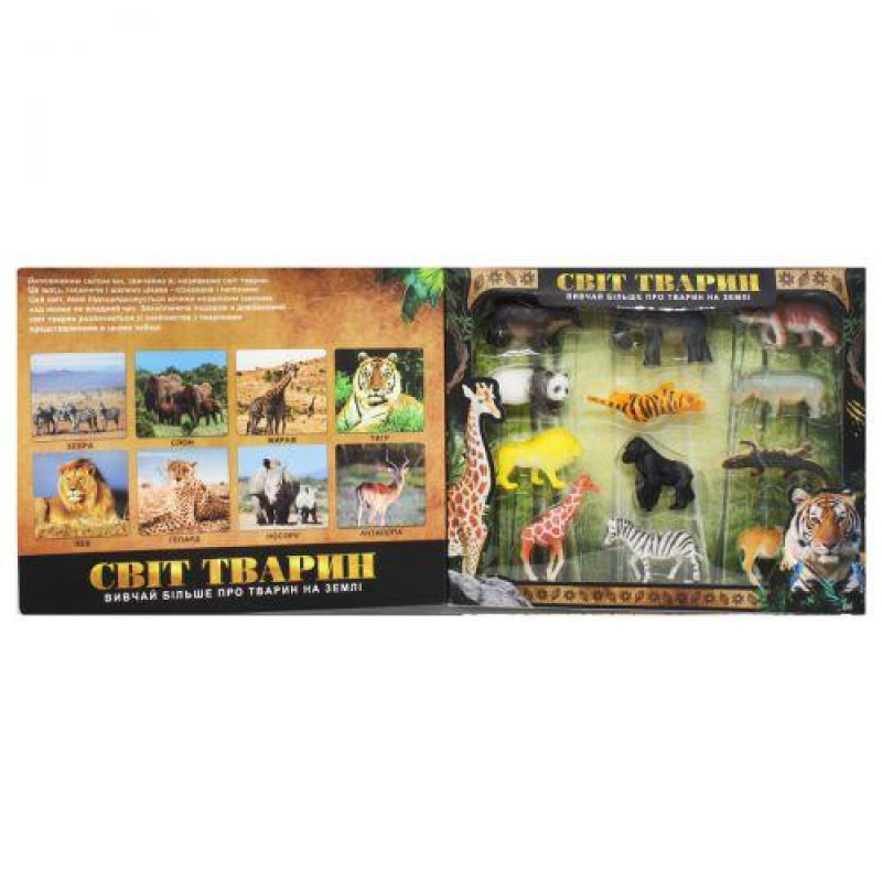 Набір познайомить дитину з приголомшливим світом диких тварин. У комплекті 12 фігурок представників фауни планети Земля: бегемот, слон, ведмідь, панда, тигр, носоріг, лев, горила, крокодил, жираф, зебра і антилопа. Розмір фігурки - 5-7 см. Виконані із щільної гуми.