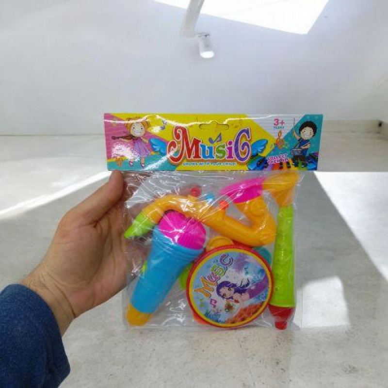 Пластикові набори музичних інструментів для дітей. У ньому є: бубон, мікрофон, сопілка та саксофон. Мікрофон, сопілка та саксофон, якщо в них подуть, видають характерний звук дудки. Цей набір сприяє розвитку музичних навичок, сприйняття звуків і вселяє дітям інтерес до творчості та музики.