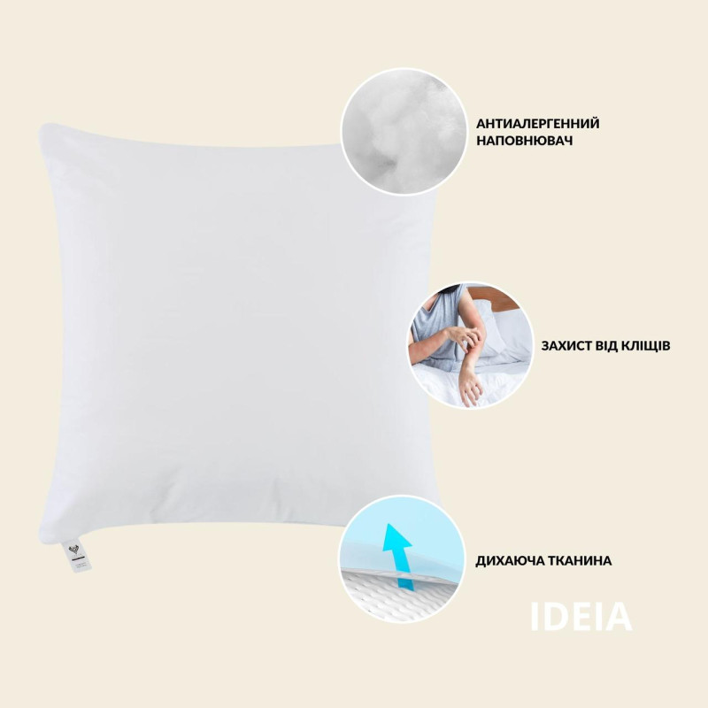 Кожна подушка з набору IDEIA зберігає пружність та форму, пропускає повітря, не збивається в грудку, не вбирає бруд та вологу. Матеріали, що використовуються при виготовленні, надійно захищені від механічних пошкоджень та стійки до прання. Крім того, кожна подушка виготовлена з екологічних та безпечних для здоров'я матеріалів, підтверджуючи це сертифікатом OEKO-TEXR STANDARD 100.