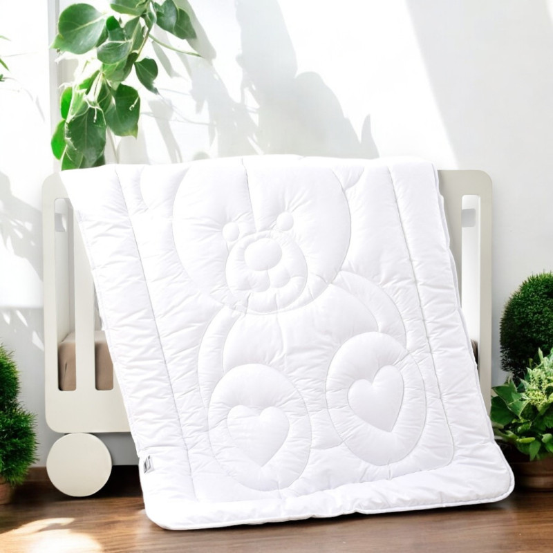 Ковдра "Ведмедик" — легка, тепла, пухка, приємна до тіла. Прикрашена художнім вистьобом у вигляді ведмедика. Ковдра добре утримує тепло. Властивості наповнювача забезпечують гарну повітропроникність. Ваш малюк не потітиме під такою ковдрою. Воно м'яке та добре огортає дитину з усіх боків. Всі елементи набору зшиті з безпечних для здоров'я матеріалів, не здатних викликати подразнення на чутливу шкіру малюка.