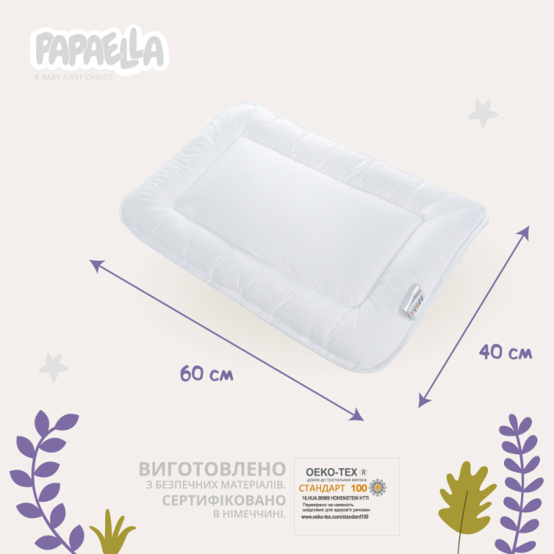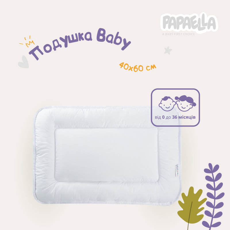 Подушка Baby — якісно зшита, має приємний вигляд, ніжна на дотик. Невисока м'яка подушка для немовлят. Форма подушки відповідає фізичним особливостям будови тіла дитини. Призначена для дітей від народження до 3 років.