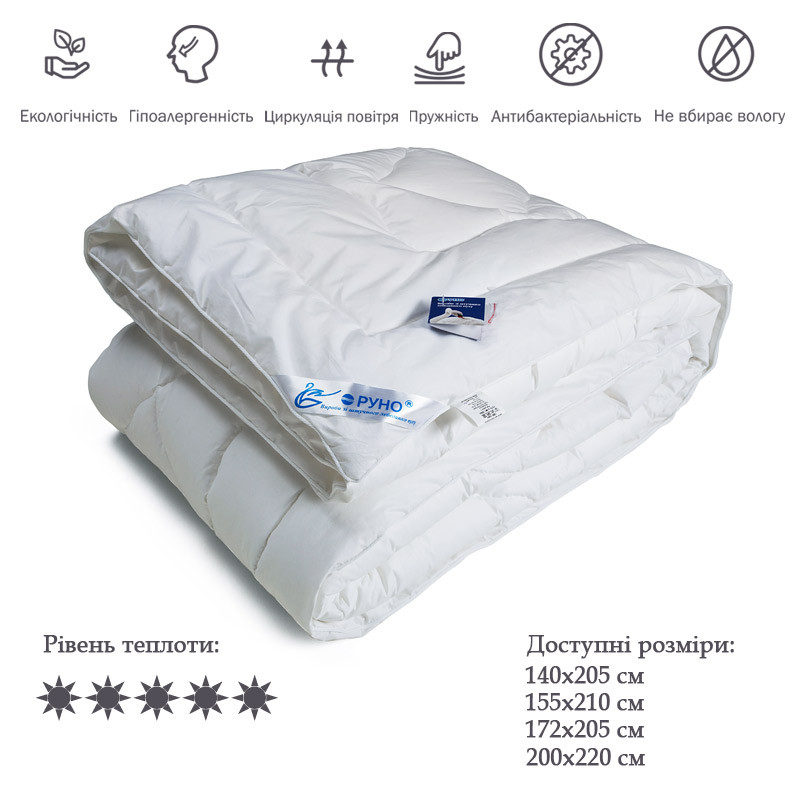 Ковдра ТМ Руно зі штучного лебединого пуху стане фаворитом Вашої спальні. Воно огорне Вас в холодну пору року теплом і турботою, при цьому залишаючись невагомим як пушинка.