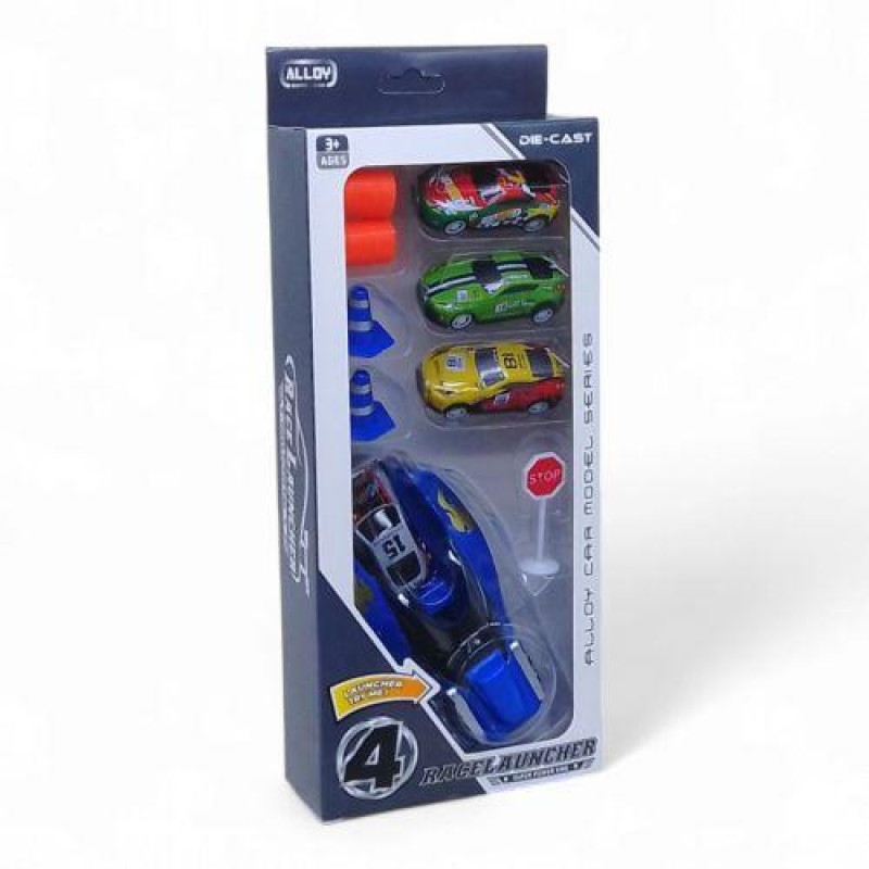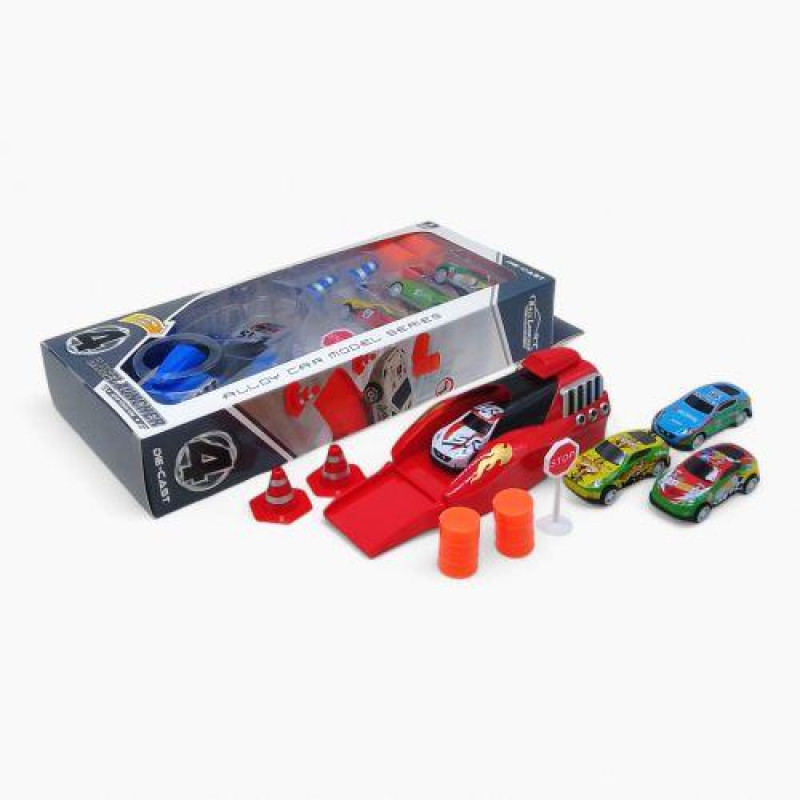 Комплектація: 4 машинки, запуск, 2 конуси, знак, 2 бочки
