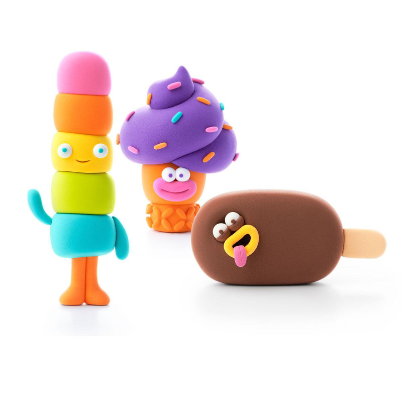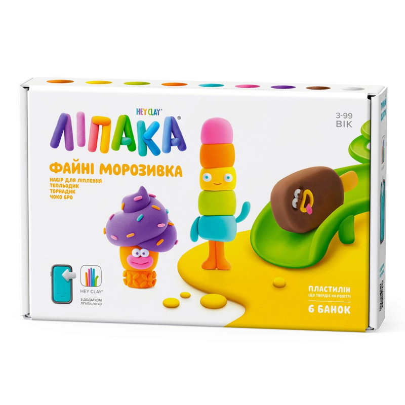 Набір самозатвердіючого пластиліну ЛИПАКА – КЛАСНЕ МОРОЖЕНЕ: ТЕПЛЕДИК, ТОРНАДИК, ЧОКО БРО – розважить дітей та дорослих. За допомогою анімаційних інструкцій у додатку HEY CLAY, Ви зможете зліпити 3 кумедних героїв. Пластилін твердне на повітрі за 24 години, після чого можна грати створеними фігурками.