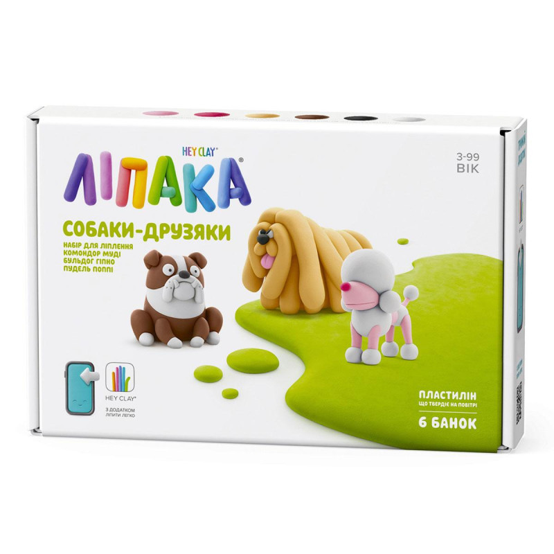 Набір самозатвердіючого пластиліну ЛИПАКА – СОБАКИ-ДРУЗІ: КОМОНДОР МУДІ, БУЛЬДОГ ГІПНО, ПУДІЛЬ ПОППІ – розважить і дітей та дорослих. За допомогою анімаційних інструкцій у додатку HEY CLAY, Ви зможете зліпити 3 кумедних героїв. Пластилін твердне на повітрі за 24 години, після чого можна грати створеними фігурками.