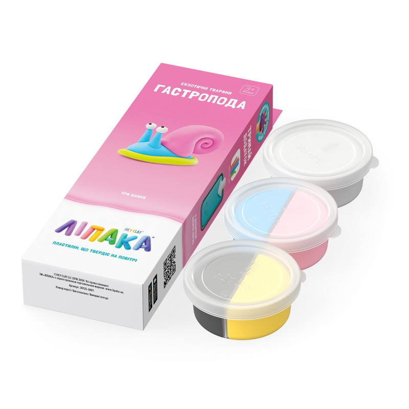 Набір пластиліну, що самостійно твердіє, ЛІПАКА - ЕКЗОТИЧНІ ТВАРИНИ: ГАСТРОПОДА – розважить і малюків і дорослих. За допомогою анімаційних інструкцій в застосунку HEY CLAY, Ви зможете зліпити кумедну гастроподу. А завдяки компактним розмірам, набір зручно брати з собою. Пластилін твердіє на повітрі протягом 24 годин, після чого можна гратися створеними фігурками.