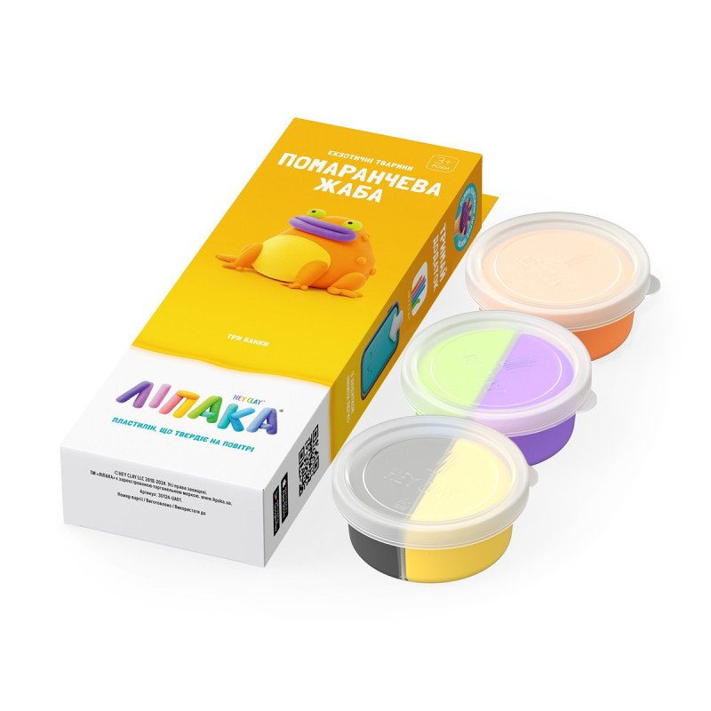 Набір пластиліну, що самостійно твердіє, ЛІПАКА - ЕКЗОТИЧНІ ТВАРИНИ: ПОМАРАНЧЕВА ЖАБА – розважить і малюків і дорослих. За допомогою анімаційних інструкцій в застосунку HEY CLAY, Ви зможете зліпити кумедну жабку. А завдяки компактним розмірам, набір зручно брати з собою. Пластилін твердіє на повітрі протягом 24 годин, після чого можна гратися створеними фігурками.