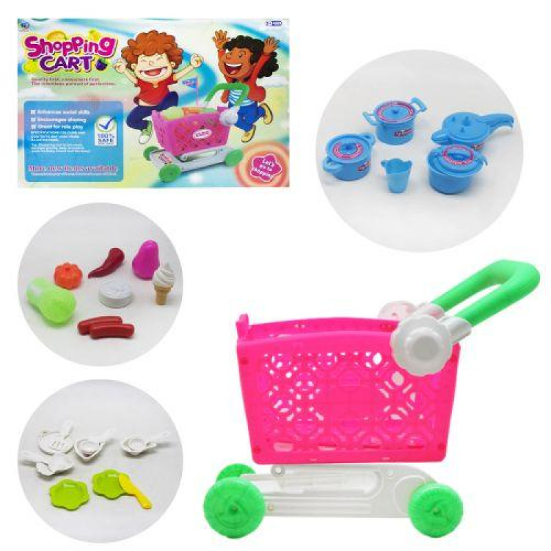 Набір складається з пластикової візки на коліщатках і яскравих різних продуктів і посуду, які можна в ній перевозити.