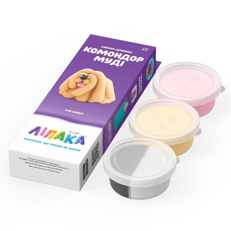 Набор пластилина, что самостоятельно затвердевает, ЛИПАКА - СОБАКИ-ДРУЗЬЯ: КОМОНДОР МУДИ - развлечет и малышей, и взрослых. С помощью анимационных инструкций в приложении HEY CLAY, Вы сможете слепить собаку. А благодаря компактным размерам, набор удобно брать с собой. Пластилин затвердевает на воздухе в течение 24 часов, после чего можно играться созданными фигурками.