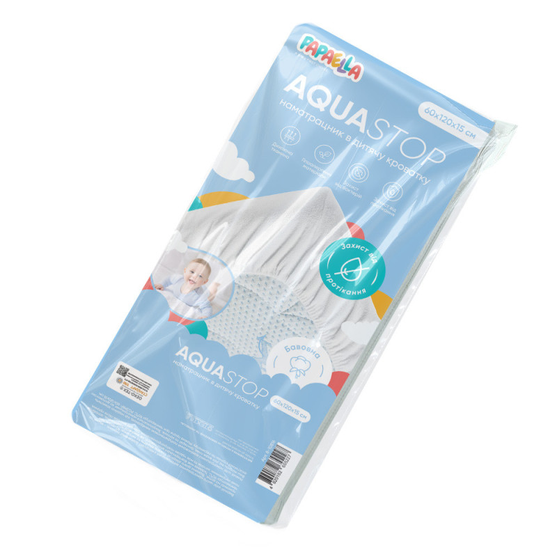 Максимальний рівень захисту. AQUA-STOP захистить матрац від різних неприємностей. Він простий, гарний, м'який та міцний. Його конструкція – борт по всьому периметру та якість тканини – ніжне махрове полотно та водонепроникна мембрана, забезпечують максимальний рівень захисту від вологи, бруду, механічних пошкоджень.