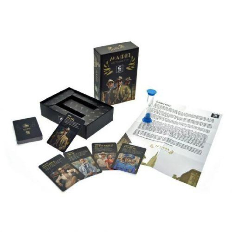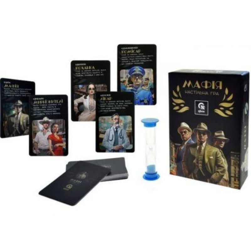 Мафія – захоплива настільна гра, в якій гравці занурюються в атмосферу інтриг та змов. Кожен учасник отримує роль: мирний житель, мафіозі чи інші особливі персонажі. Мета мафії – вбивати мирних жителів уночі, а ціль мирних – знайти та знищити мафіозі. Пісочний годинник у комплекті.