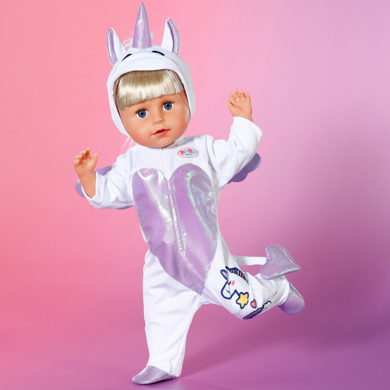 Після ванни BABY born потрібен теплий і комфортний костюмчик, який захистить дитину від протягів. А милий комбінезончик єдинорога, крила і хвостик, а також смішні вушка зроблять BABY born дуже стильною. Одяг виготовлено з високоякісних матеріалів.