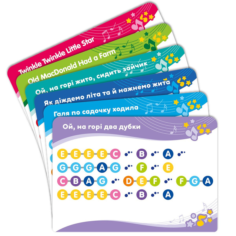 12 нотних карток – з нотами українських та англійських пісеньок, які можна вставити у спеціальне поглиблення.