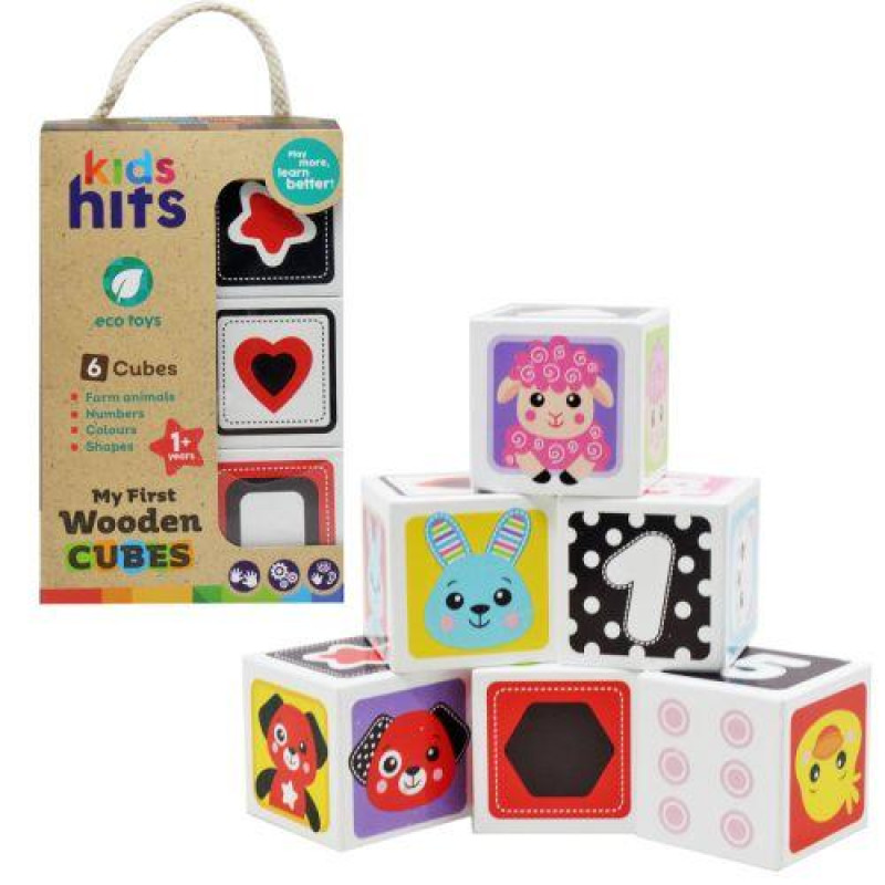 Набір із 6-ти дерев'яних кубиків "My first wooden cubes". На різних сторонах кубиків зображені звірятка, числа, різні кольори та форми, що дозволить навчити дитину безлічі нових навичок. Кубики виконані з екологічно чистих матеріалів, повністю безпечні для дитини. Розмір одного кубика: 6х6х6 см.