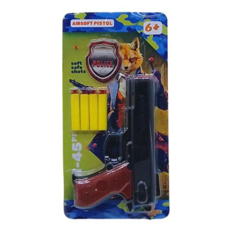 Безпечна та цікава зброя для ігор на свіжому повітрі або в приміщенні. Він стріляє м'якими поролоновими набоями на присосках, що робить його безпечним для дітей. Пістолет виконаний із міцного пластику, має зручний дизайн, легко заряджається та ідеально підходить для активних ігор. 4 патрони і поліцейський значок в комплекті.