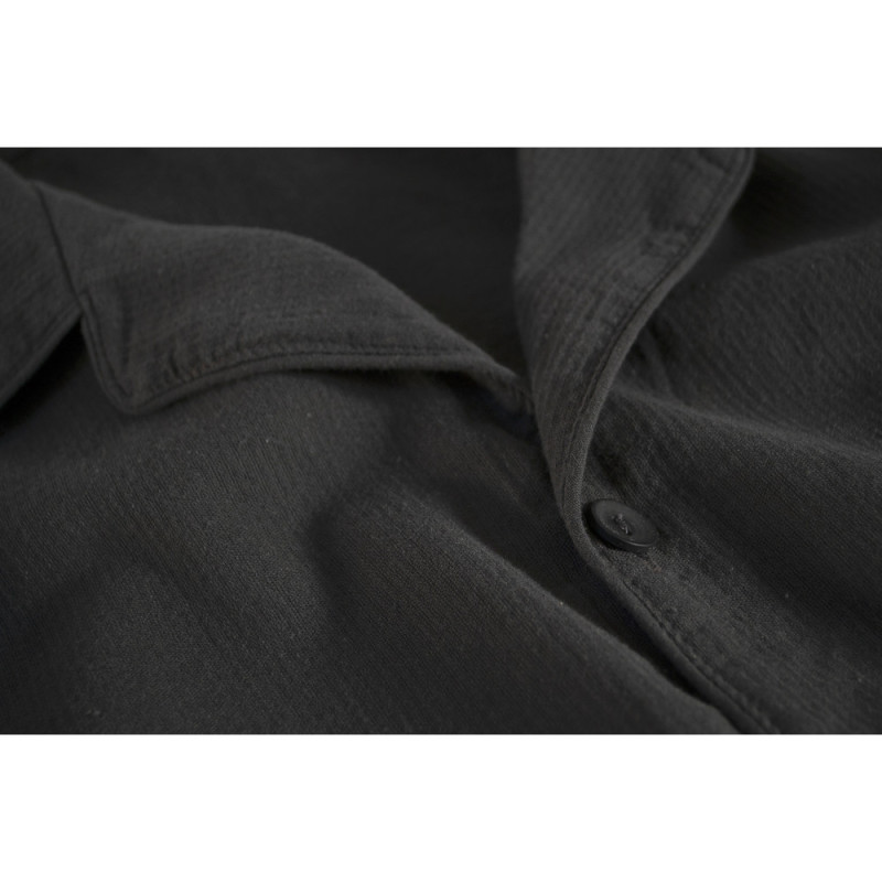 Сорочка на ґудзиках, має двобортний комір і бічні нижні розрізи. Штани прямого крою з гумкою та утяжками на талії, виріб має дві бічні кишені.
