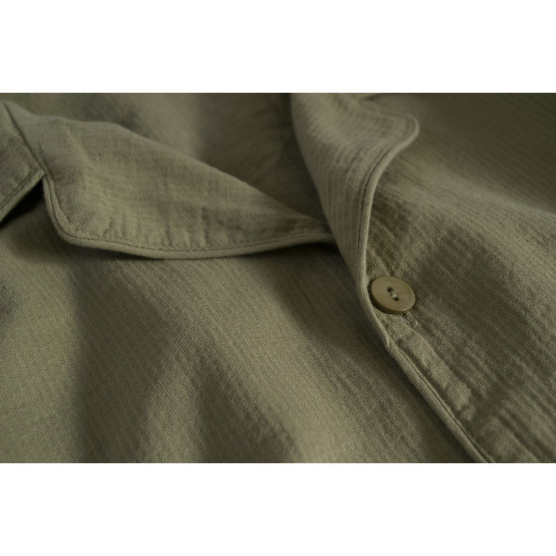 Сорочка на ґудзиках, має двобортний комір і бічні нижні розрізи. Штани прямого крою з гумкою та утяжками на талії, виріб має дві бічні кишені.