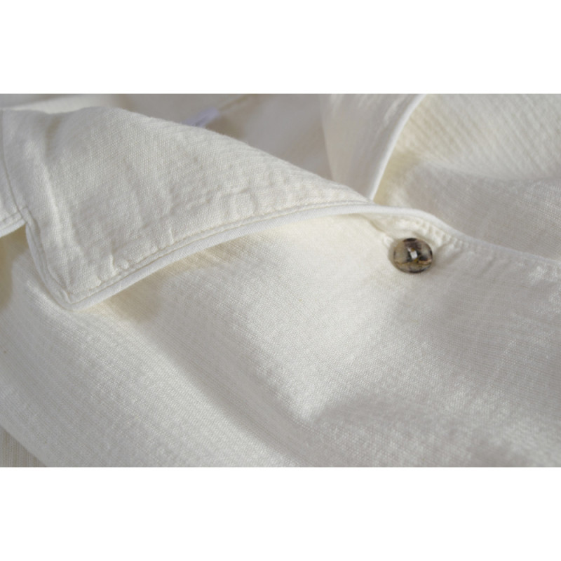 Сорочка на ґудзиках, має двобортний комір і бічні нижні розрізи. Штани прямого крою з гумкою та утяжками на талії, виріб має дві бічні кишені.