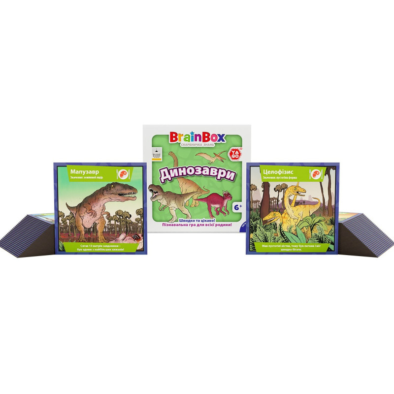 У грі «Динозаври» ви знайдете 55 карток, в кожній з яких містяться цікаві факти про 55 різних динозаврів! Уважно розглядайте їх, а потім спробуйте дати відповідь на 330 різних запитань, використовуючи лише власну пам’ять! Грайте та навчайтеся всією родиною разом з BrainBox!