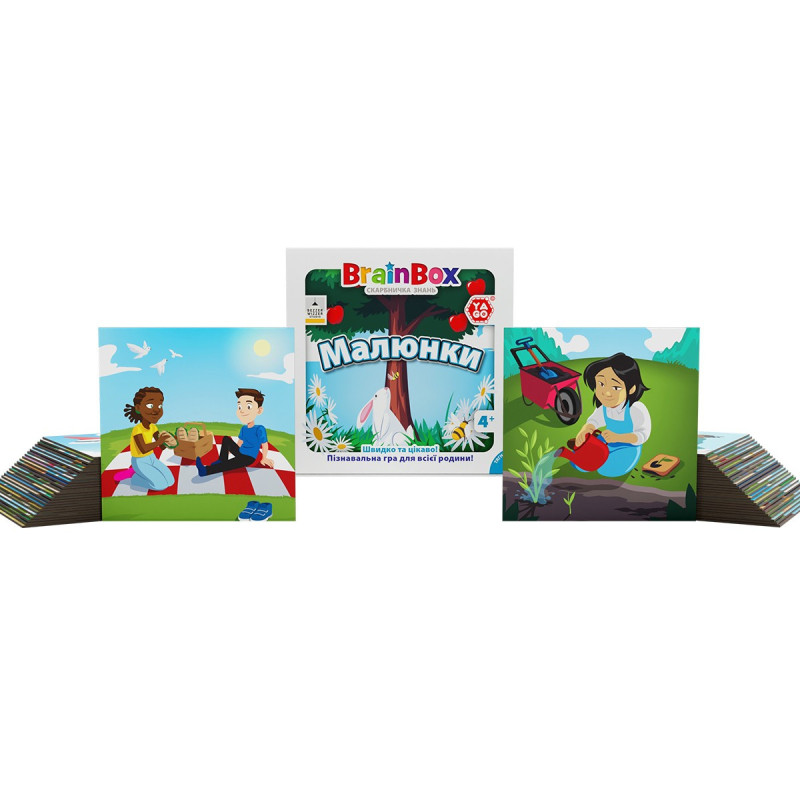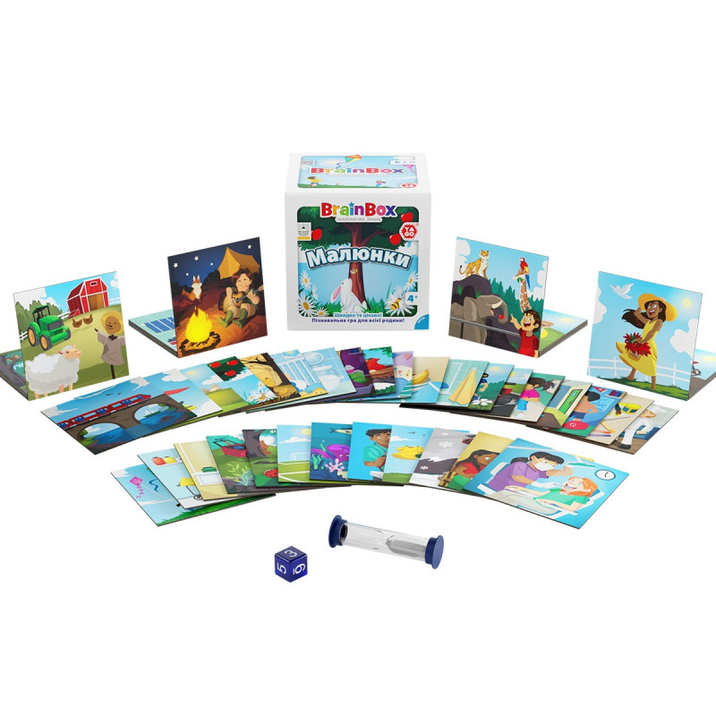 У наборі «Малюнки» ви знайдете 55 різних карток на теми повсякденного життя, спорту, тварин та прогулянок на природі! Уважно розглядайте їх, а потім спробуйте дати відповідь на 330 різних запитань, використовуючи лише власну пам’ять! Грайте та навчайтеся всією родиною разом з BrainBox!