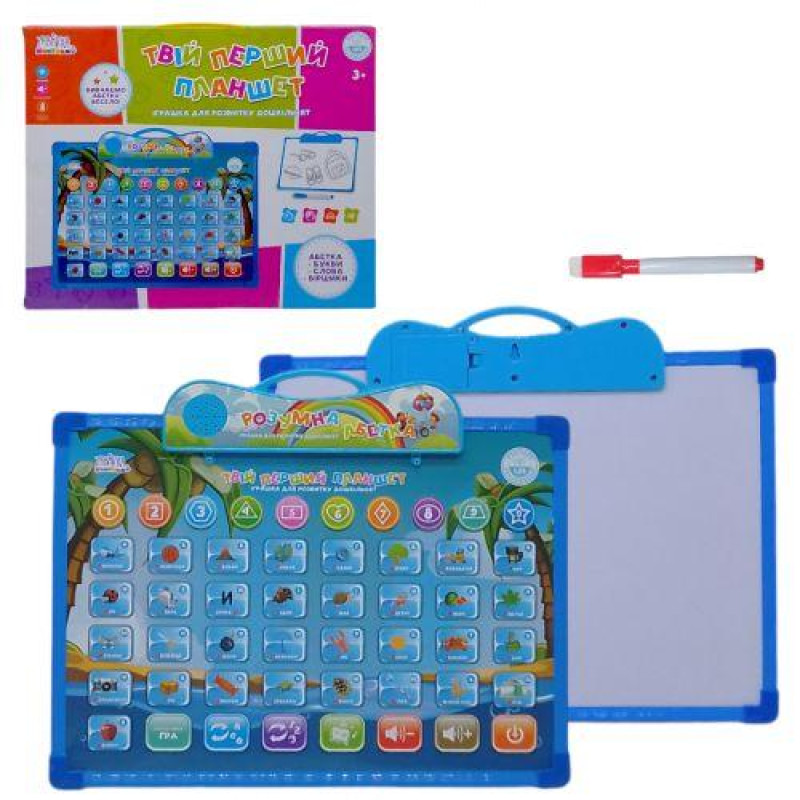 Іграшка для розвитку дошкілнят: планшет, озвучений українською мовою та дошка для малювання.