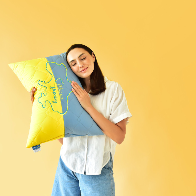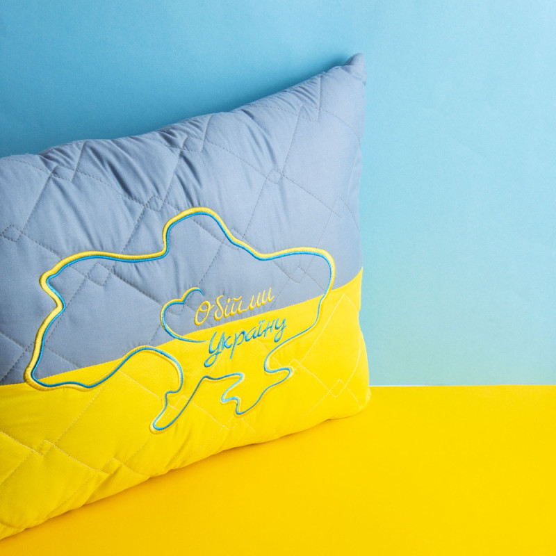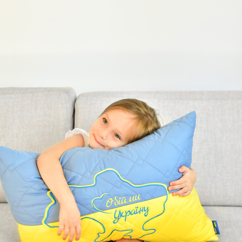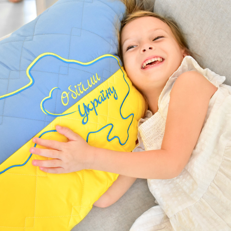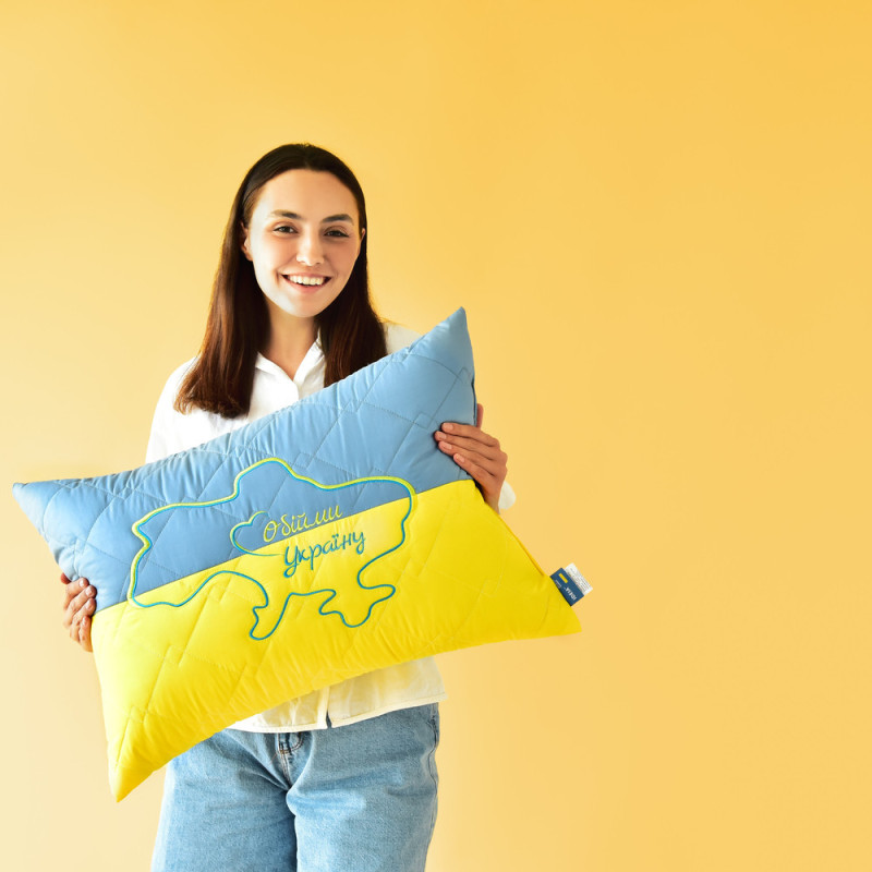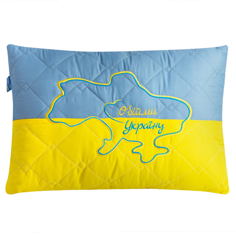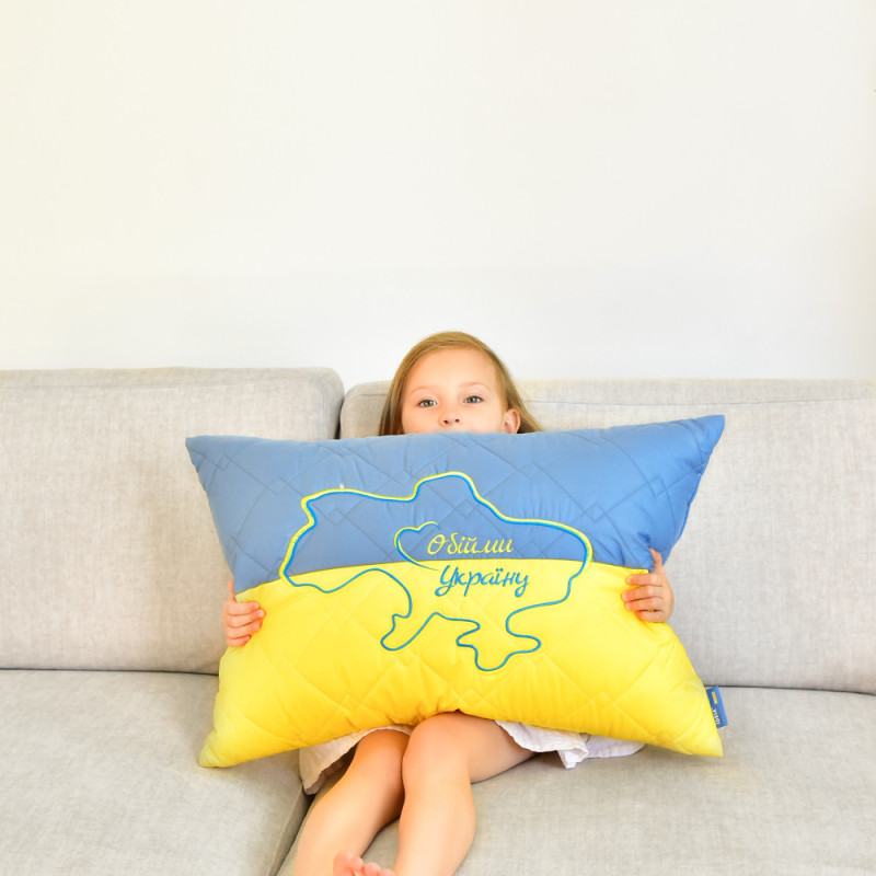 Подушка двокольорова. Верх подушки – синього кольору. Низ – жовтого. По центру вишита мапа України та напис – Обійми Україну. Напис «Обійми Україну» – заклик до об`єднання нашої рідної країни.