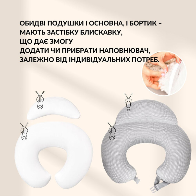 Обидві подушки й основна, і бортик — мають блискавку застібку. Блискавки розташовані так, щоб уникнути травматизму маляти. Язичок застібки ховається в кишеню. Можна додати або прибрати наповнювач залежно від індивідуальних потреб.