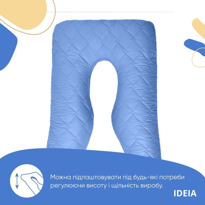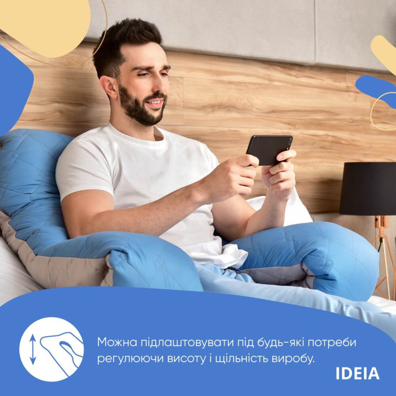 П-подібна подушка IDEIA має чохол, підсилений вистебом. Подібне рішення робить подушку пружнішою, дозволяє краще тримати форму та відновлювати її. Чохол подушки двоколірний, пошитий з гіпоалергенної, антибактеріальної тканини – мікрофібра. Наявна застібка блискавка, що спрощує догляд за подушкою. Наволочку можна прати без наповнювача. Наповнювач – це пружне поліефірне волокно, оброблене силіконом, у вигляді кульок. Наволочка з вистебом не зминається, добре переться. Наповнювач не вбирає пил, запахи та вологу.