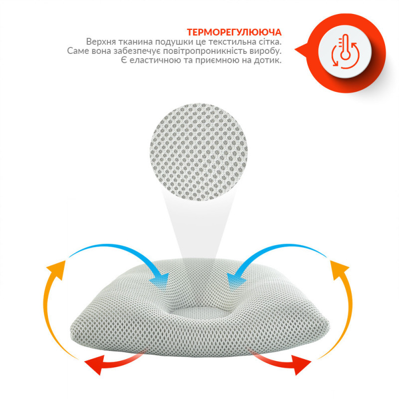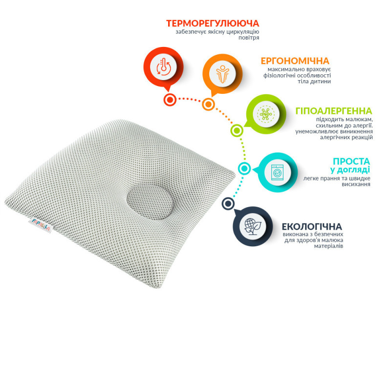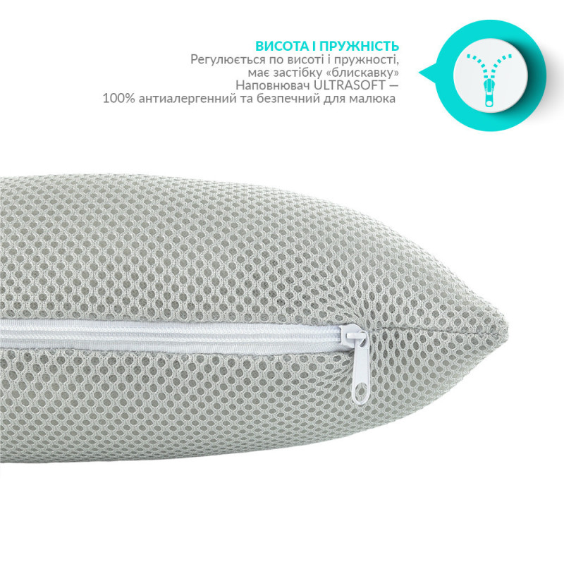 Як наповнювач використовується антиалергенне волокно Ultrasoft. Воно надає виробу пружності й упору, необхідний для підтримки голови та шиї. І чохол, і наповнювач не вбирають бруд, вологу, запахи тощо. Їхня структура забезпечує комфортний рівень вентиляції та гарантує приємний сон удома в ліжечку та на прогулянці в колясці.