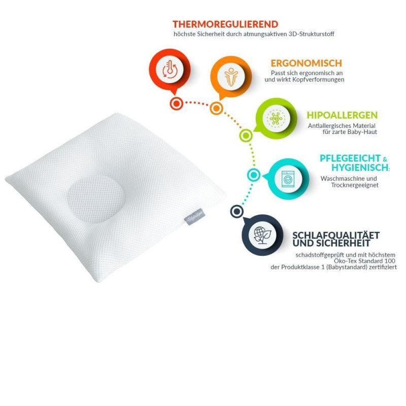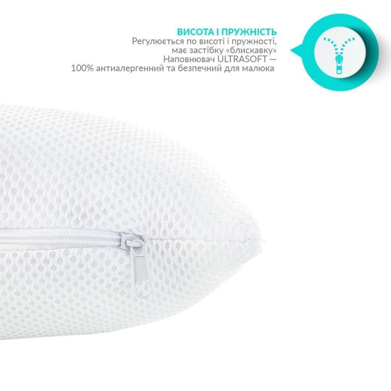 Як наповнювач використовується антиалергенне волокно Ultrasoft. Воно надає виробу пружності й упору, необхідний для підтримки голови та шиї. І чохол, і наповнювач не вбирають бруд, вологу, запахи тощо. Їхня структура забезпечує комфортний рівень вентиляції та гарантує приємний сон удома в ліжечку та на прогулянці в колясці.