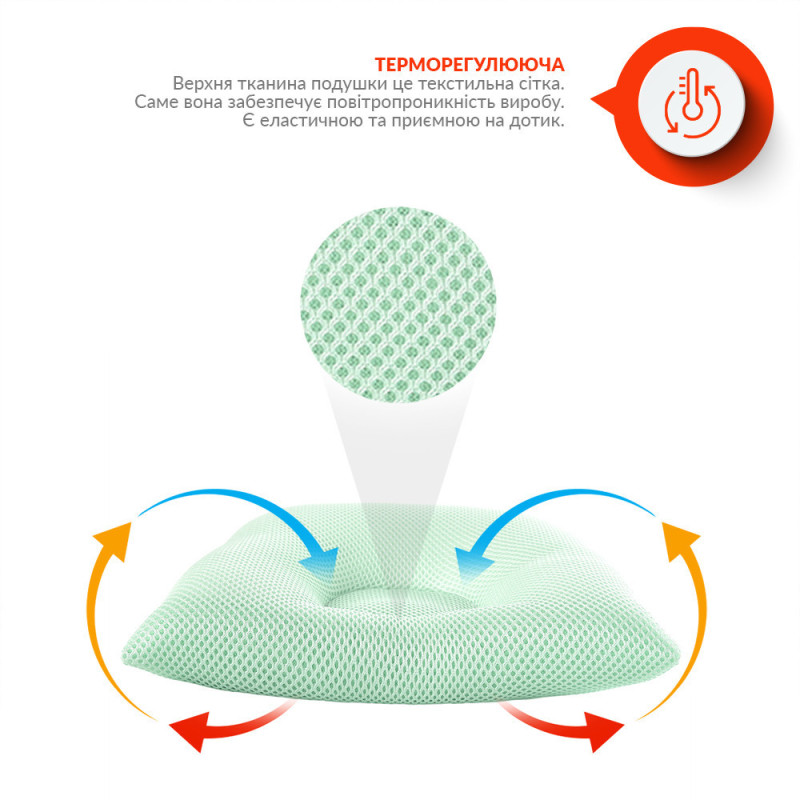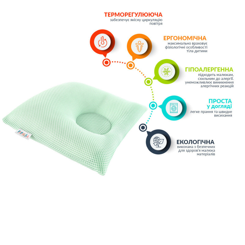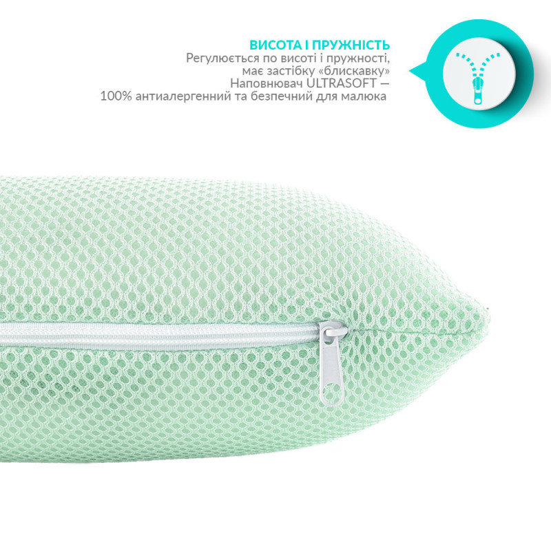 Як наповнювач використовується антиалергенне волокно Ultrasoft. Воно надає виробу пружності й упору, необхідний для підтримки голови та шиї. І чохол, і наповнювач не вбирають бруд, вологу, запахи тощо. Їхня структура забезпечує комфортний рівень вентиляції та гарантує приємний сон удома в ліжечку та на прогулянці в колясці.