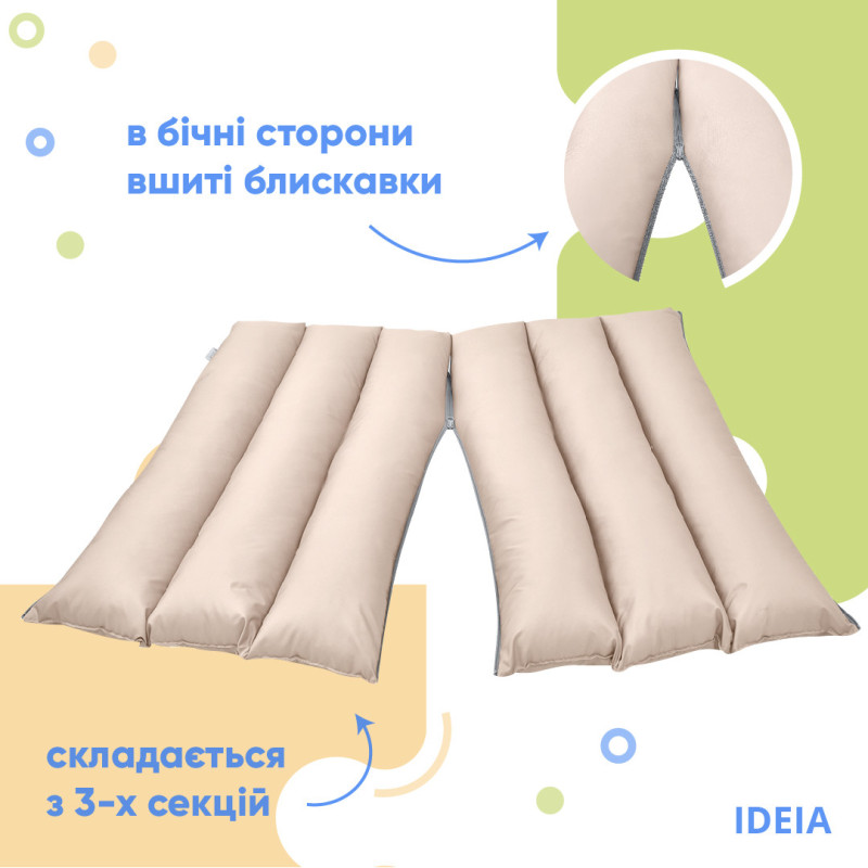 Оригінальна та багатофункціональна подушка, в боці якої вшиті блискавки, складається з 3-х секцій і зручно трансформується в компактний валик. Система блискавок дає можливість поєднувати кілька подушок в єдиний виріб необхідної довжини і використовувати їх як килимок або матрац.