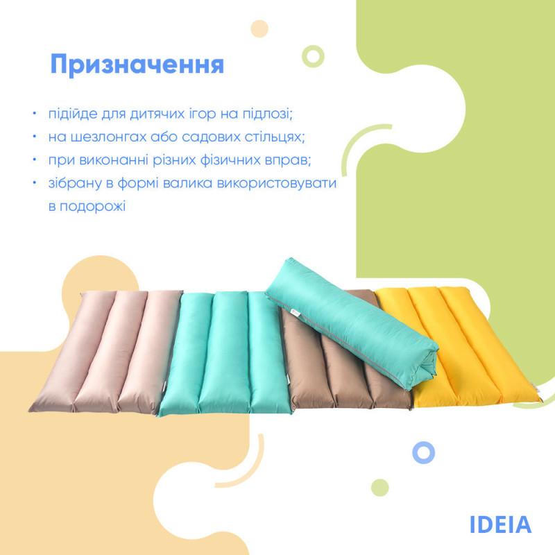 Призначення: підійде для дитячих ігор на підлозі; в якості подушки або матраца стане в нагоді на шезлонгах або садових стільцях; при виконанні різних фізичних вправ для підтримки різних частин тіла; зібрану в формі валика добре використовувати в подорожі для підтримки шийного відділу хребта.