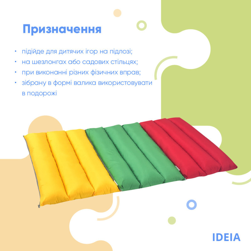 Призначення: підійде для дитячих ігор на підлозі; в якості подушки або матраца стане в нагоді на шезлонгах або садових стільцях; при виконанні різних фізичних вправ для підтримки різних частин тіла; зібрану в формі валика добре використовувати в подорожі для підтримки шийного відділу хребта.