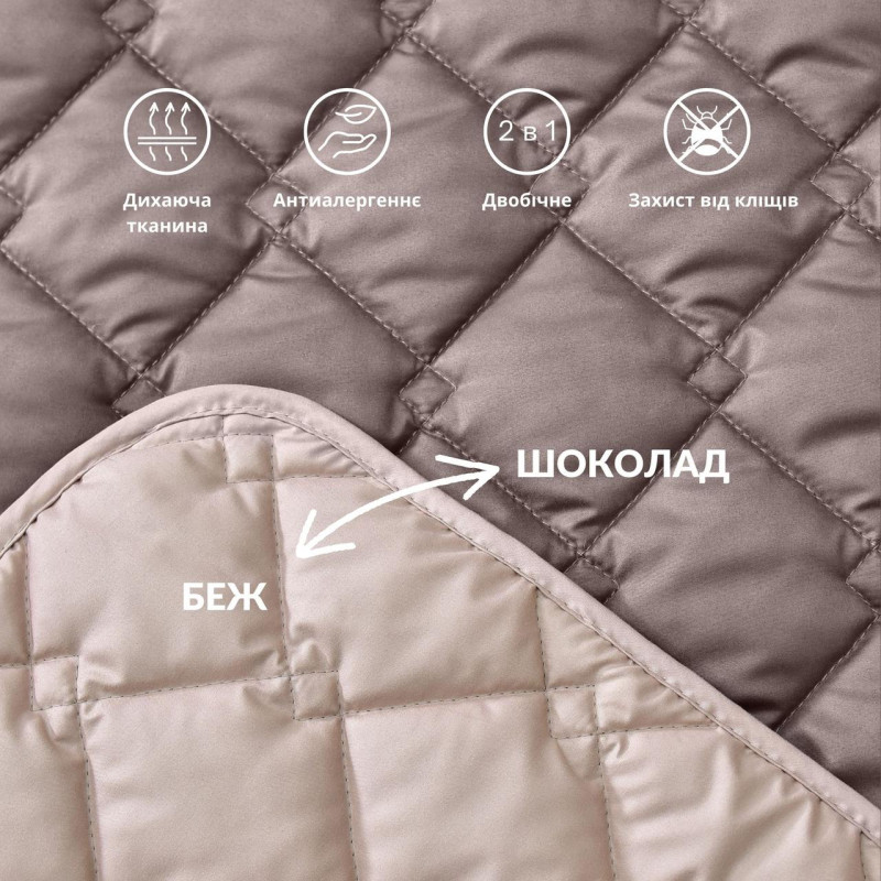 Двосторонній дизайн: Дві кольорові сторони (шоколадна та бежева) надають універсальності, дозволяючи змінювати вигляд спальні залежно від настрою.