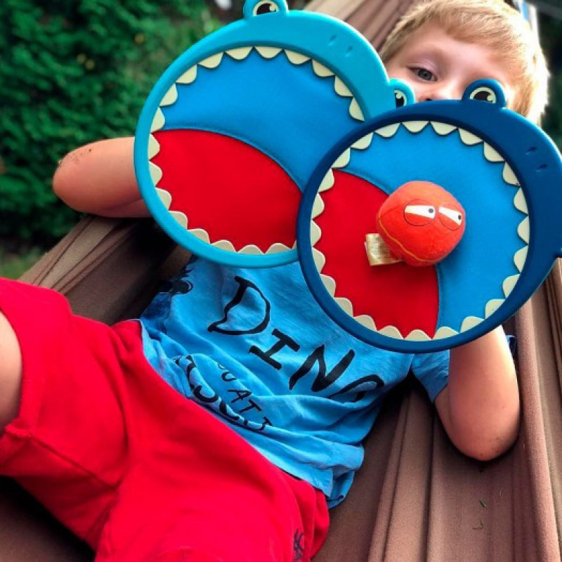 - Яскраві ракетки з великою липучою поверхнею виконані у вигляді кумедних акул, а м'ячик - у вигляді веселих рибок