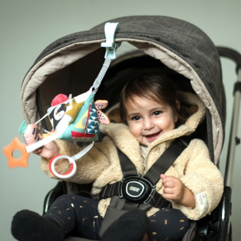 - Легко кріпиться до коляски або автокрісла за допомогою зручного затискача