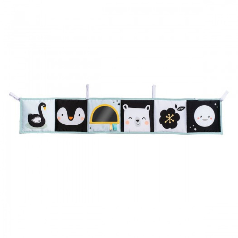 - Перша сторона чорно-біла, для найменших дітей від 0 до 3 місяців. На ній розташовані контрастні зображення з однією великою картинкою в центрі, щоб малюк міг на ній сфокусуватися та уникнути зайвої стимуляції, а також безпечне дзеркальце для перших усмішок. Це розвиває сенсорику та емоційний інтелект з перших днів життя дитини.