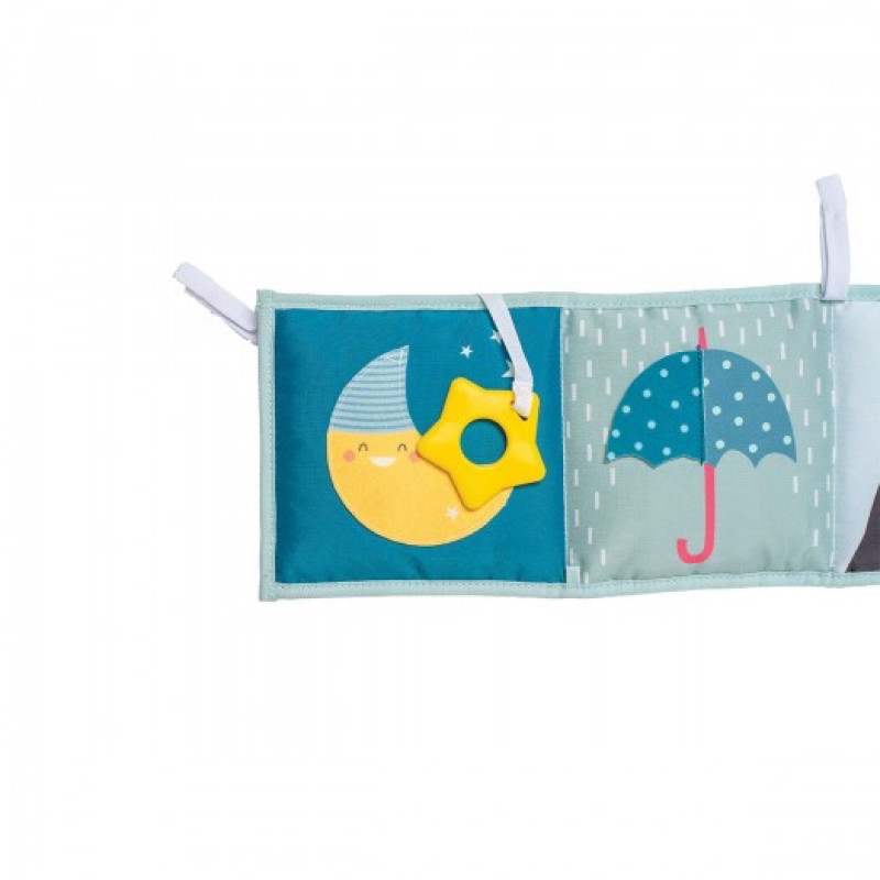 - Друга сторона яскрава та кольорова – для малюків від 3 міс. На ній розташовані різнокольорові картинки, різноманітні текстури і 3D-інтерактивні функції: прорізувач-зірочка, що ховається в кишеньці, рухливі деталі, сторінки, що шелестять, які допоможуть розвинути дрібну моторику.