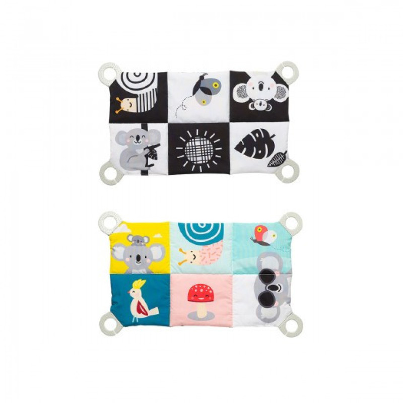 - розвиває сенсорний двосторонній центр для двох етапів розвитку малюка: 0-3 міс .: чорно-біла сторона; 3+ міс .: різнокольорові барвисті малюнки зі вставками тканин різних текстур і розвиваючими елементами.