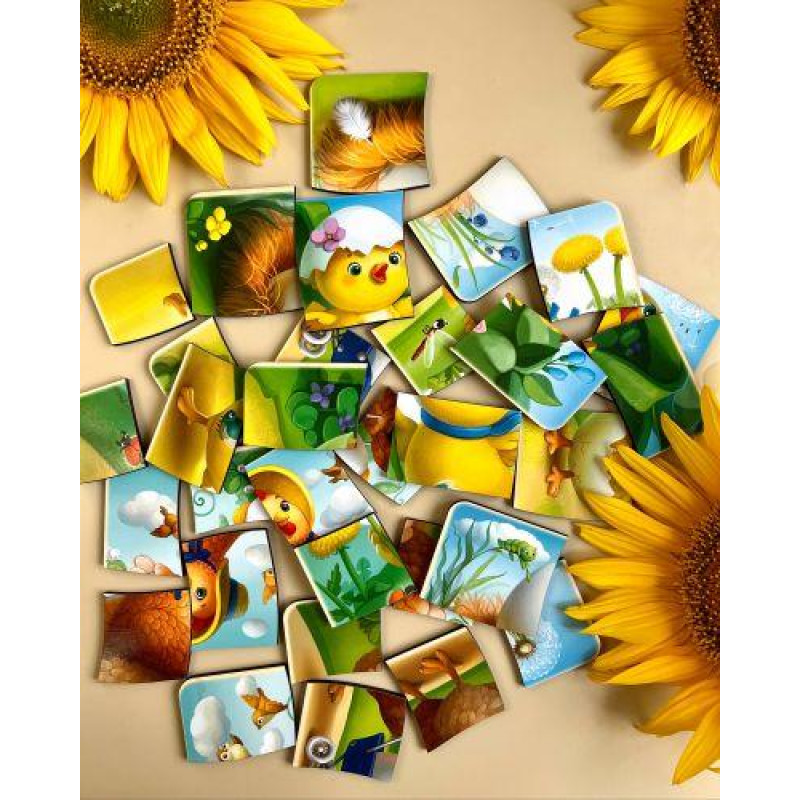 Чотиришаровий пазл з яскравими ілюстраціями. Різного рівня складності: на 4, 6, 9 і 12 деталей. Зліва намальовані картинки, як підказка для малюка. 31 деталь в наборі.