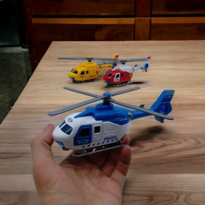 Інерційна іграшка у вигляді реалістичного гвинтокрила. Виготовлена з металу та пластику. Відчиняються передні двері. На гелікоптері є дві кнопки: одна включає світлові та звукові ефекти, інша змушує обертатися лопаті. Розмір іграшки – 20 х 7 х 4,5 см.